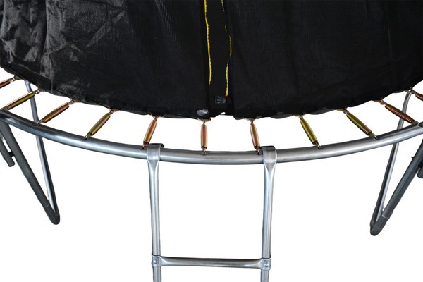 Упругость снаряду придают 54 пружины, равномерно распределяющих энергию при каждом отталкивании. Комплектация включает защитный мат, ножки, защитную сетку и стойки для ее крепления, а также лестницу — такое оснащение предотвращает случайные травмы и падения с высоты, а также упрощает подъем на платформу.