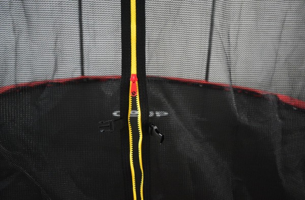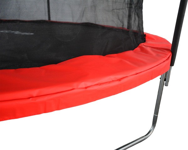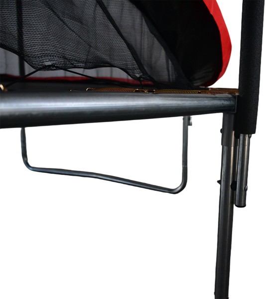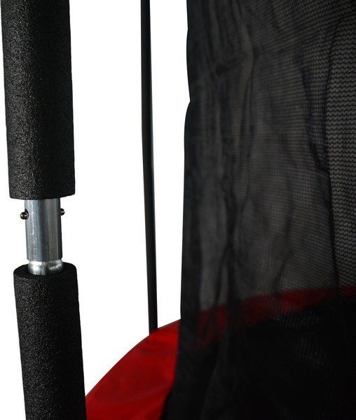 Черная рама из металла не деформируется даже под высокими интенсивными нагрузками. Прыжковое полотно черного цвета с красным акцентом из полипропилена устойчиво к истиранию и перепадам температуры — преимущество для круглогодичного использования на открытом воздухе.