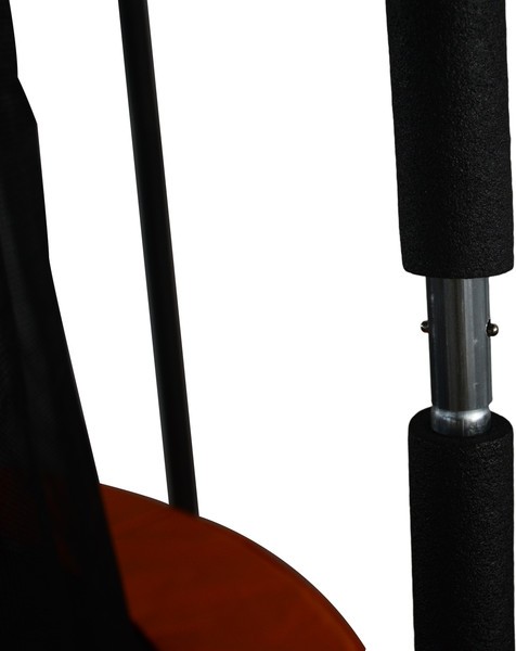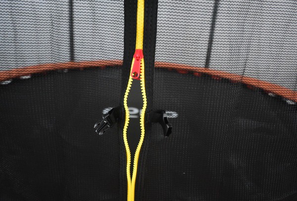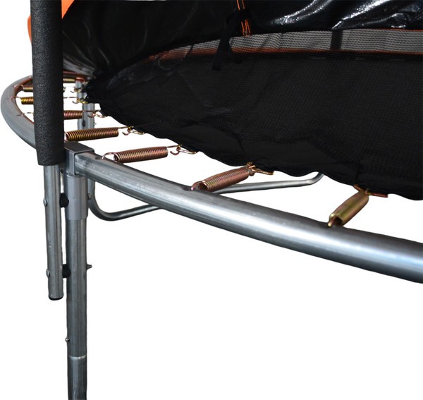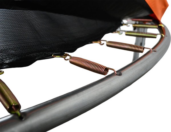 Черная рама из металла не деформируется даже под высокими интенсивными нагрузками. Прыжковое полотно черного цвета с оранжевым акцентом из полипропилена устойчиво к истиранию и перепадам температуры — преимущество для круглогодичного использования на открытом воздухе.
