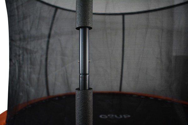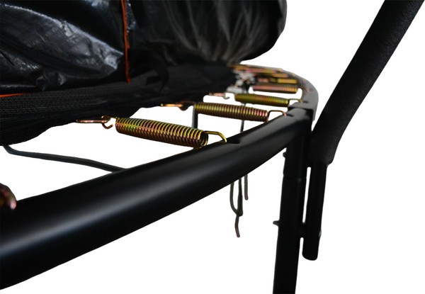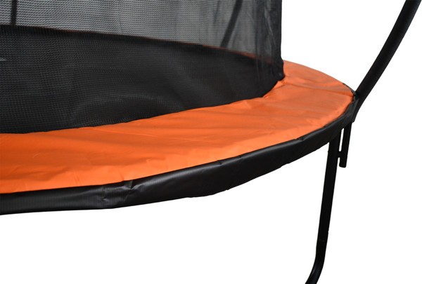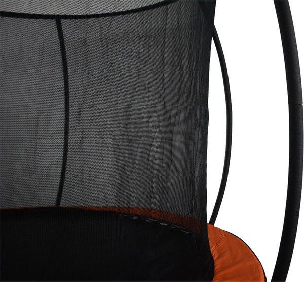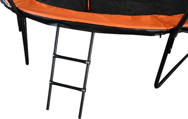 Батут для улицы представлен в черном цвете с оранжевыми акцентами. Конструкция создана для активного отдыха на свежем воздухе без необходимости постоянного контроля. Рама выполнена из металла (38×1.3 мм, 6 шт.), что придает жесткость всей системе. Прыжковое полотно из полипропилена устойчиво к истиранию и осадкам, сохраняя упругость в течение долгого времени. Пружины (3×136 мм, 54 шт.) натягивают поверхность равномерно — это позволяет отталкиваться с одинаковым усилием из любой точки.