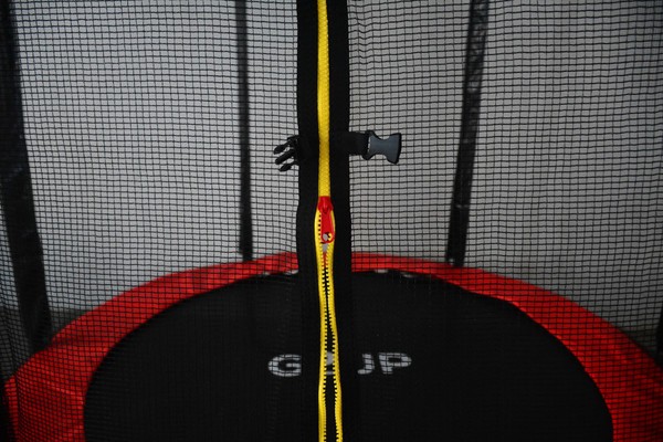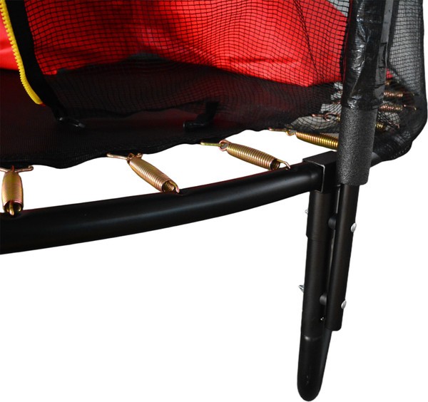 Черный с красным акцентом цвет делает снаряд заметным на участке: темная основа практична в уходе, а яркие вставки добавляют динамики внешнему виду. Использование такого батута дает возможность организовать досуг на улице с четкими границами прыжковой зоны и прочной фиксацией всех элементов.