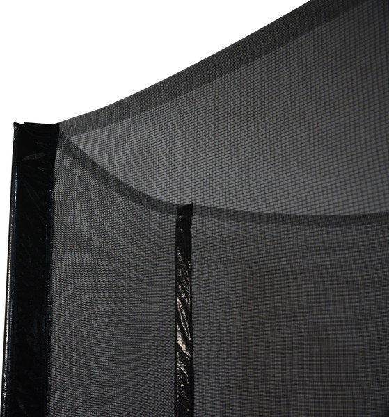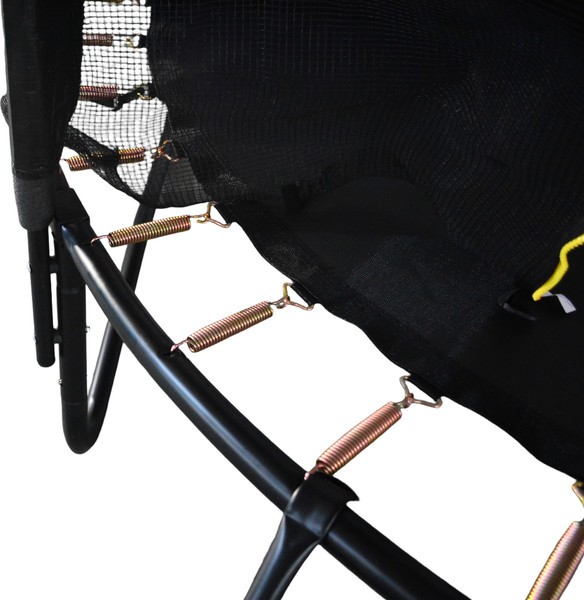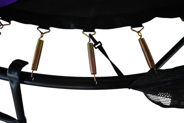 Черный цвет с фиолетовым акцентом делает конструкцию строгой, но визуально заметной. Прочная основа из металла (38×1.3 мм) выдерживает интенсивные нагрузки — такой запас жесткости продлевает срок службы. Высота батута без защитных элементов составляет 55 см, что удобно для монтажа и удобного старта. С установленной защитной сеткой общая высота достигает 155 см — параметр, предотвращающий случайные падения.
