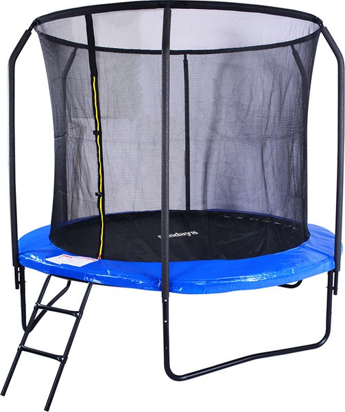 Батут для улицы с защитной сеткой создает безопасные условия для активного отдыха. Конструкция выдерживает максимальную нагрузку до 150 кг. Сочетание синего и черного цветов сохраняет внешний вид при использовании на открытом воздухе.