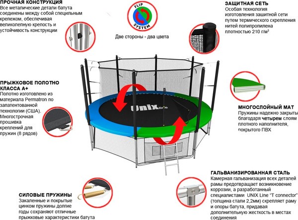 Металлический каркас батутов выполнен из прочной гальванизированной стали, максимально допустимый вес пользователя 170 кг. Прыжковое полотно производится из специального высокопрочного материала Permatron, устойчивого к любым неблагоприятным воздействиям окружающей среды и механическим воздействиям. Permatron — эластичный материал, легко возвращающийся в исходное состояние при постоянном воздействии с разной нагрузкой. Он устойчив к внешним воздействиям: ультрафиолету, плесени, влаге, резким изменениям температуры. Термическая обработка делает эту ткань устойчивой к постоянным изгибам и стрессовым нагрузкам. Прыжковое полотно для батута, изготовленное из перматрона, подходит для применения дома и на улице. Этот материал не боится осадков и воздействия солнечных лучей, также обладает антисептическими свойствами. Защитный мат для пружин, расположенный по периметру батута, состоит из четырех слоев, обшитых ПВХ материалом, плотностью 130 г/см³ и надежно закрывает пружины.