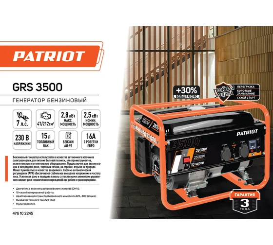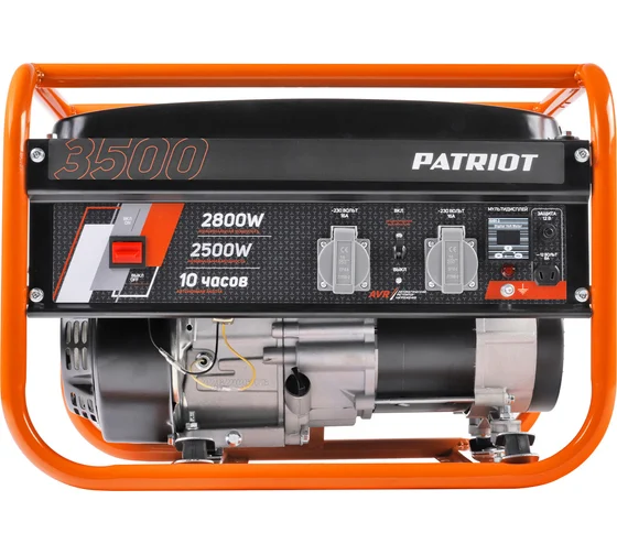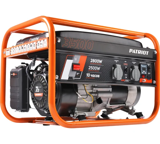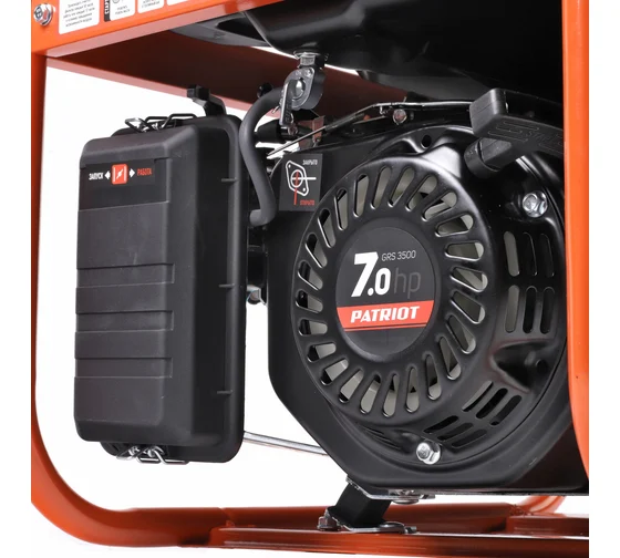 Бензогенератор Patriot GRS 3500 (электростанция открытого типа) 2.8/2.5 кВт, четырехтактный двигатель 212 см3, топливный бак на 15 л, ручной стартер, однофазный, розетки: 220 В (2х16А).