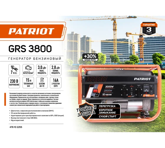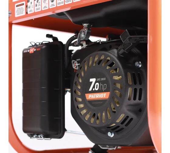 Бензогенератор Patriot GRS 3800 (электростанция открытого типа) 3/2.8 кВт, четырехтактный двигатель 212 см3, топливный бак на 15 л, ручной стартер, однофазный