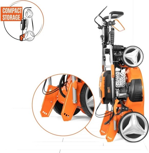Современная конструкция двигателя и складная рукоятка позволяют компактно хранить газонокосилку в вертикальном положении.