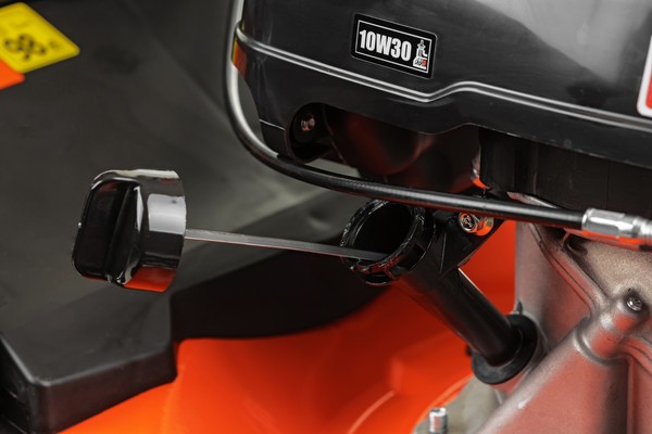 Ручка регулируется по высоте и складывается для компактного хранения в сарае или гараже. Четыре колеса с разным диаметром: передние на 200 мм легче маневрируют, а задние на 250 мм улучшают проходимость на неровностях. Емкость топливного бака составляет 0.85 литра, чего хватает на продолжительную работу без частых дозаправок.