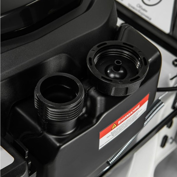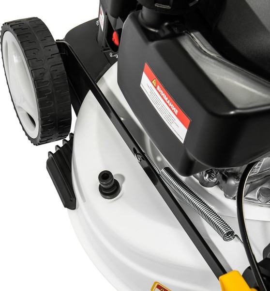 - Упрощенный процесс очистки рабочей части: газонокосилка оснащена штуцером для подключения шланга и подачи воды.