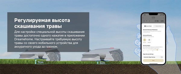 Высота скашивания травы от 3 до 7 см, ширина скашивания травы составляет 22 см.