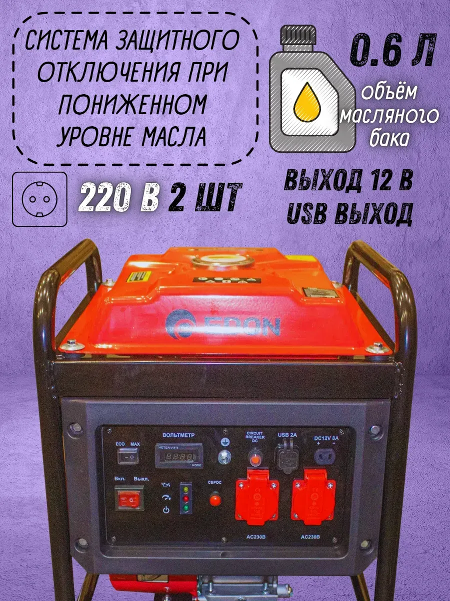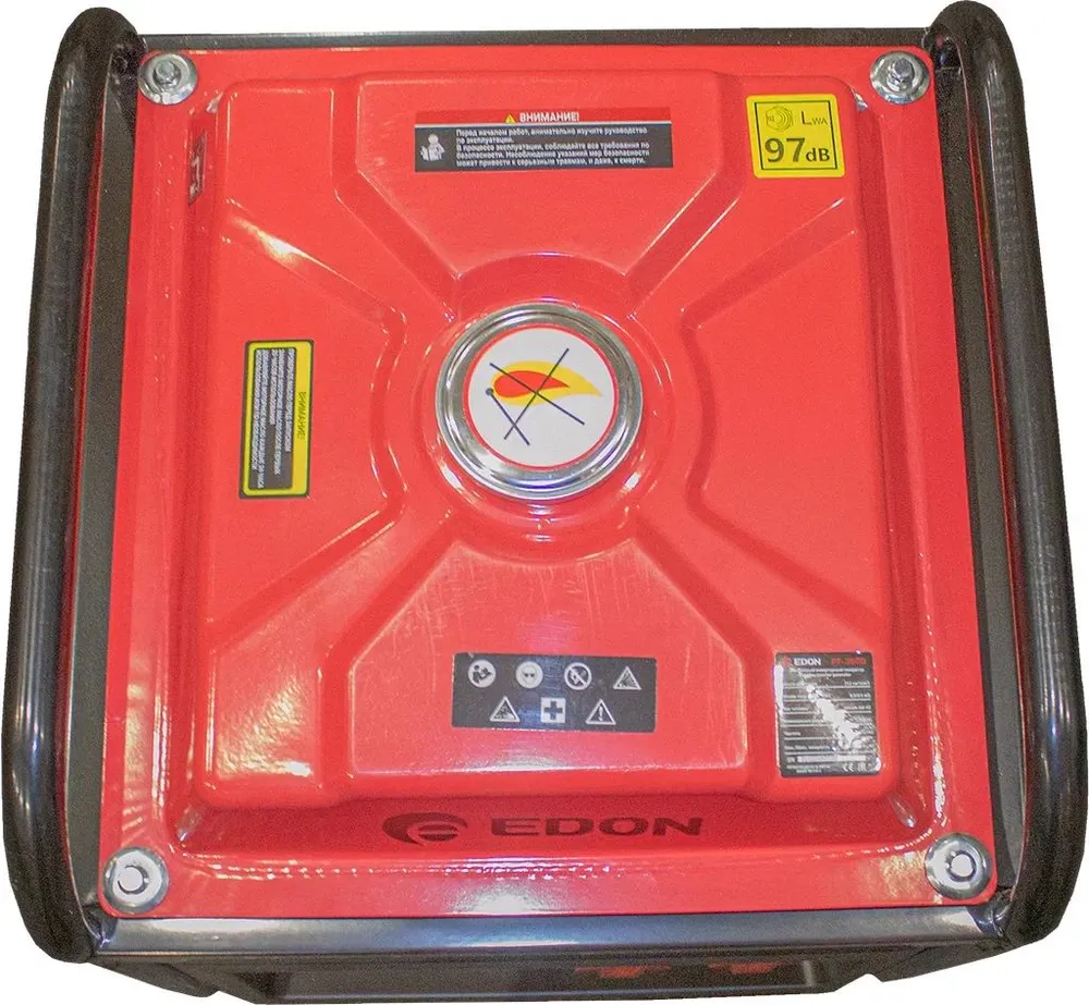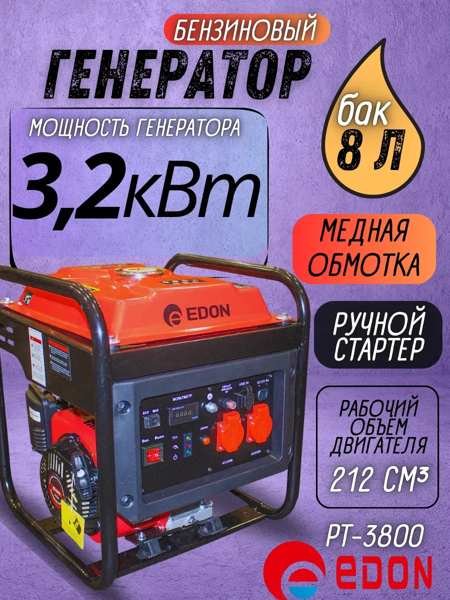 Бензогенератор Edon PT-3800 в открытом корпусе с ручкой, 3200/3000 Вт, однофазный, четырехтактный двигатель 212 см3, топливный бак на 8 л, ручной запуск, 2 розетки 220 В, USB и выход 12 В, 26.5 кг.