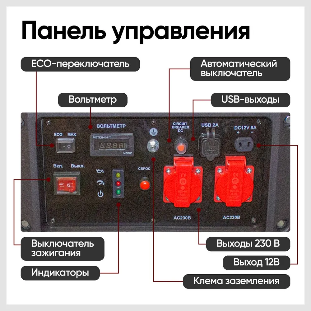 - переключатель ECO (когда переключатель включен, система сама регулирует скорость двигателя в соответствии с подключенной нагрузкой);