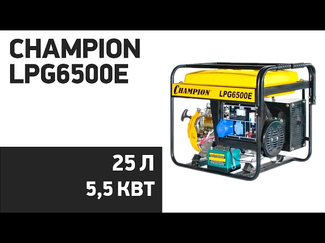 Бензогенератор Champion LPG6500E в открытом исполнении без колес, 5500/5000 Вт, 230 В, однофазный, четырехтактный двигатель 389 см3, топливный бак на 25 л, ручной запуск / электростартер, 2 розетки 230 В, 85 кг.