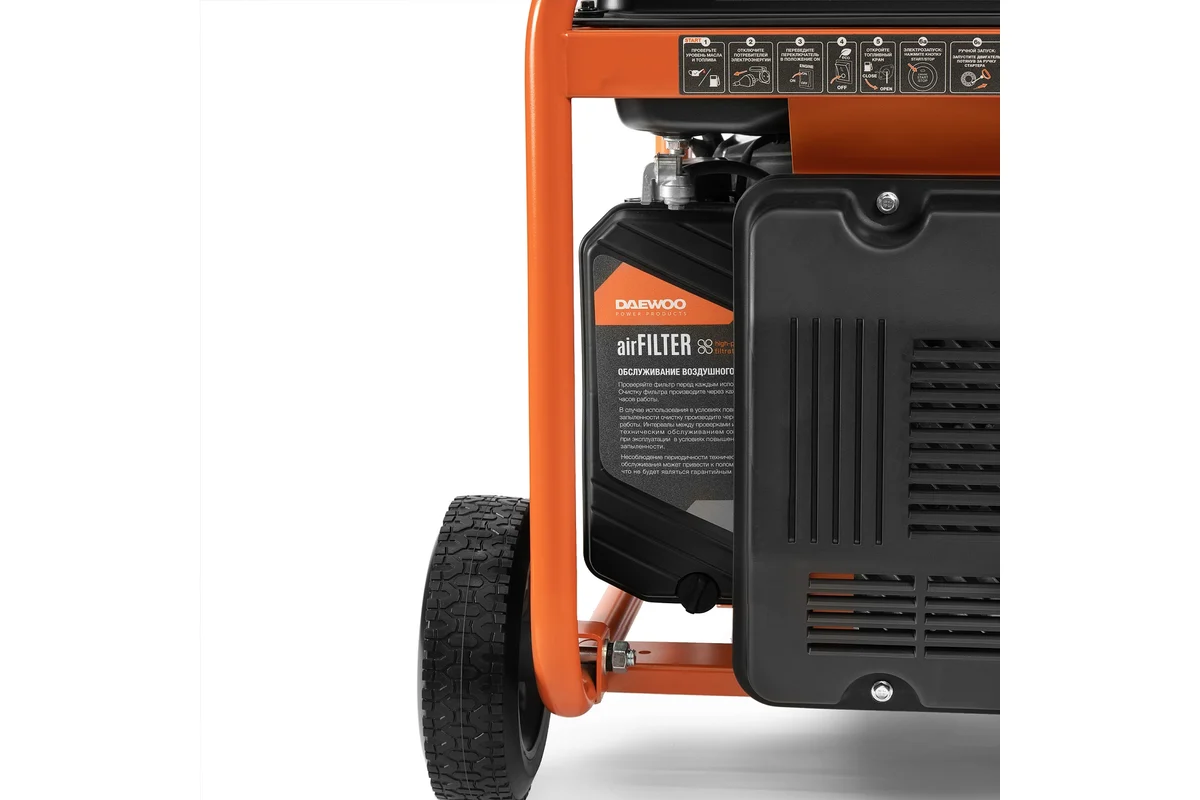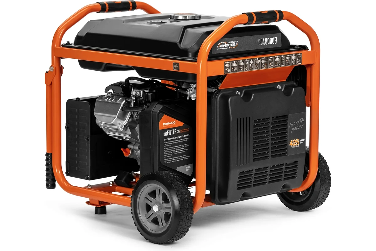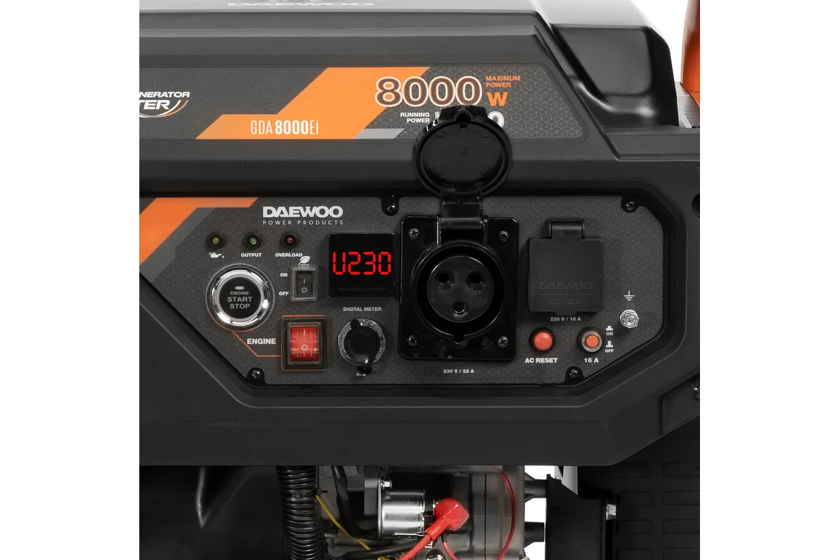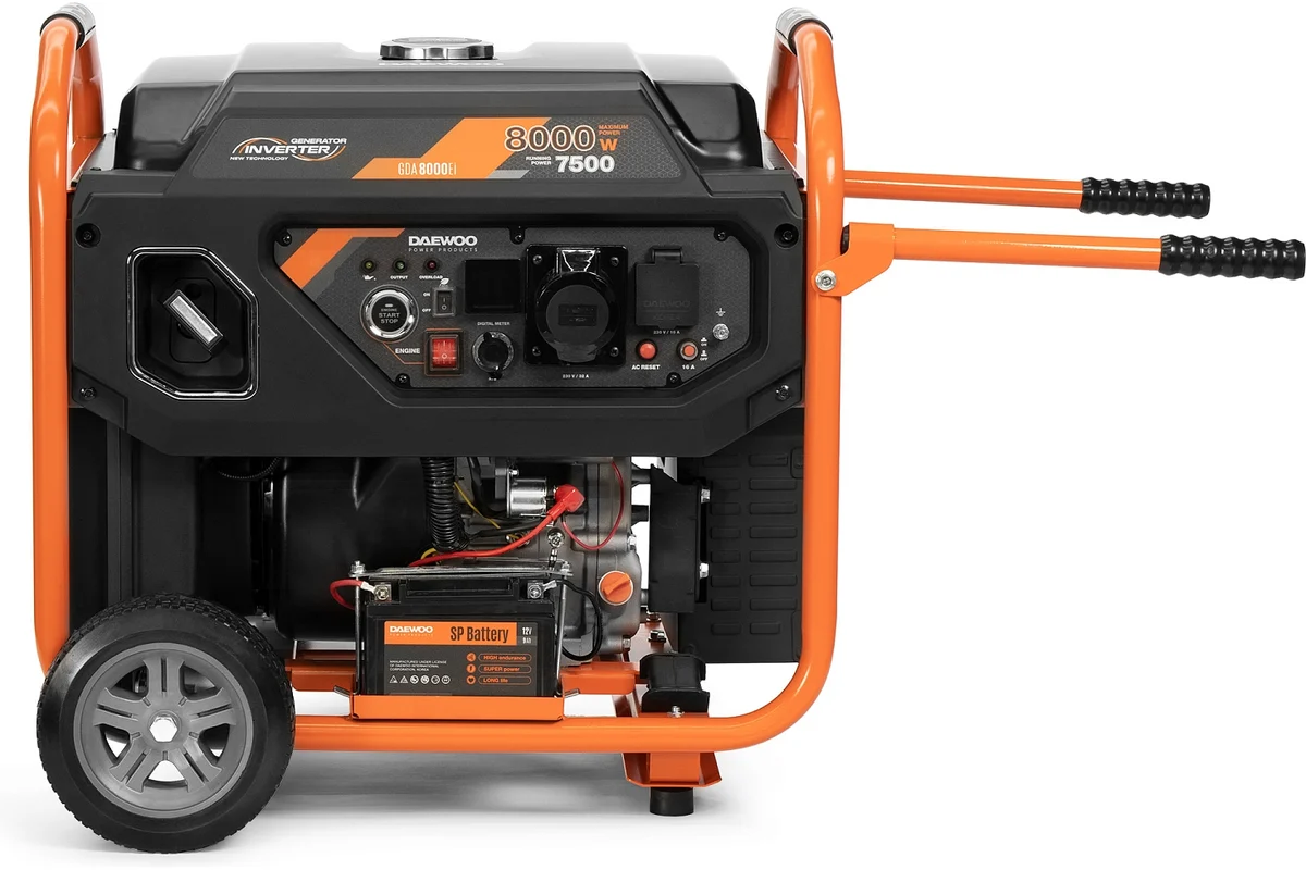 Генератор бензиновый инверторный Daewoo GDA 8000Ei, бензиновый двигатель, исполнение: открытое, номинальная мощность: 7.5 кВт, запуск: ручной/электростартер, вес: 64 кг