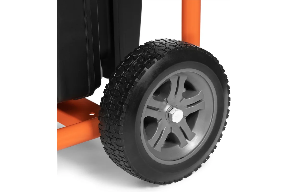 Состоит из колес, стояночных опор и складной рукоятки.