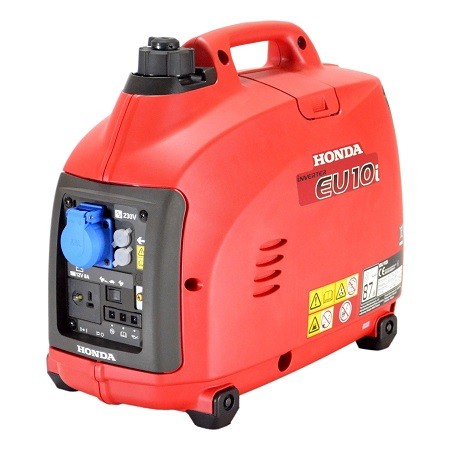 Инверторный бензогенератор Honda EU10i-T1GW1 в закрытом корпусе, ручка для переноски, 1000/900 Вт, однофазный, четырехтактный двигатель 50 см3, топливный бак на 2.3 л, ручной запуск, 1 розетка 230 В, выход 12 В, 13 кг.
