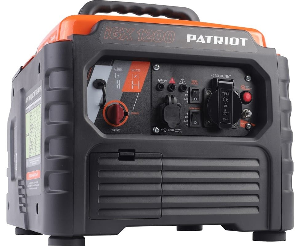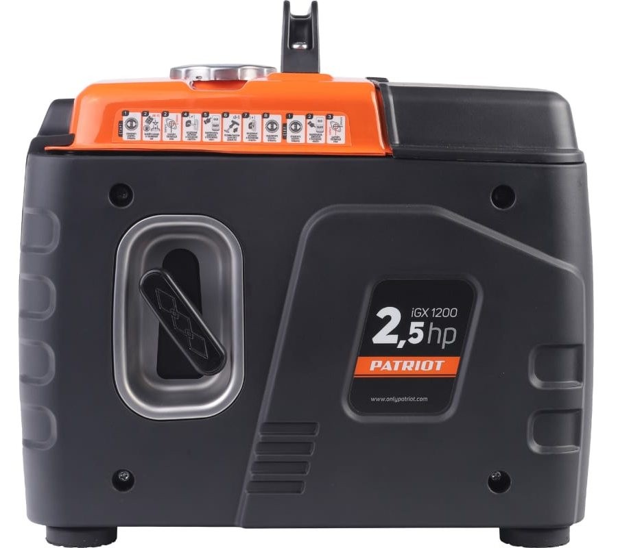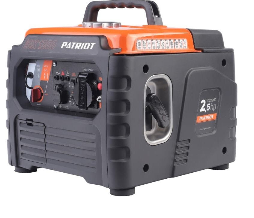 Инверторный бензогенератор Patriot iGX 1200 (электростанция открытого типа) 1.2/1 кВт, четырехтактный двигатель 56 см3, топливный бак на 3 л, ручной стартер, 72 дБ, однофазный, розетки: 230 В (1х16 А).