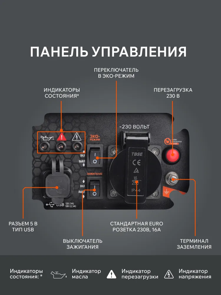 - Индикация состояния генератора: наличие напряжения, низкий уровень масла, перегрузка.