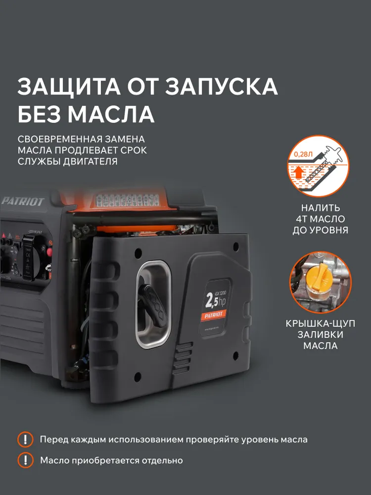 - Защита от сухого запуска (без масла), защита от перегрузки.