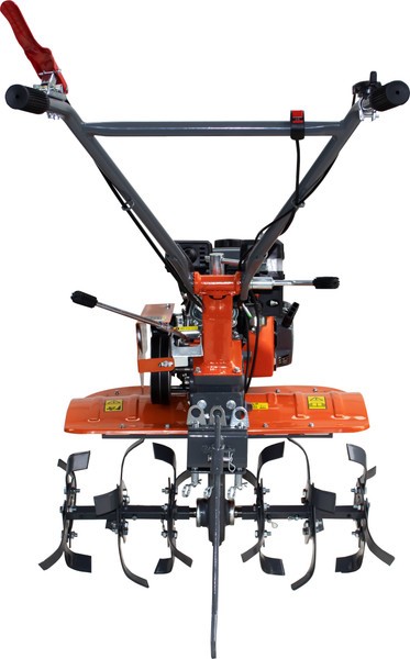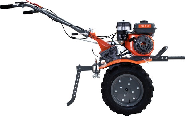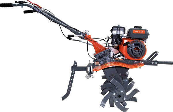 Мотоблок бензиновый МБ7-10 двигатель в 7 л.с., способный существенно облегчить обработку почвы. Закаленные фрезы, поставляемые в комплекте, способны справиться с любой почвой. Сошником можно быстро и легко отрегулировать глубину погружения, что позволяет подстроить аппарат под конкретный вид почвы. Рабочая ширина обработки составляет 100 см. Датчик уровня масла предохраняет от поломок двигателя, если масла станет слишком мало. Поршневая группа хромирована и усилена, что повышает ее надежность. Есть 2 скорости – 2 передних и 1 задняя, которая облегчает извлечение мотоблока из почвы. Шестеренчатый редуктор в масляной ванне имеет повышенную надежность. Корпус редуктора чугунный.