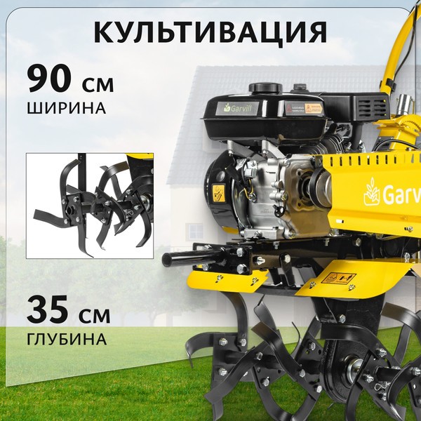Ширина культивации — 90 см, глубина — 35 см, что позволяет быстро обрабатывать участки без лишних усилий. В комплекте идут фрезы диаметром 35 см, а также возможна установка дополнительного навесного оборудования: плуга, окучника, грунтозацепов или роторной косилки. Система агрегатирования на основе кронштейна позволяет быстро и надежно подсоединять различные аксессуары.