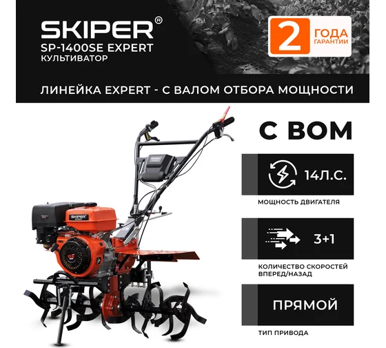 Мотоблок бензиновый Skiper SP-1400SE Expert + Ручка (14л.с. с ВОМ 3+1, без колёс)