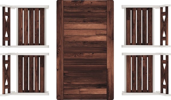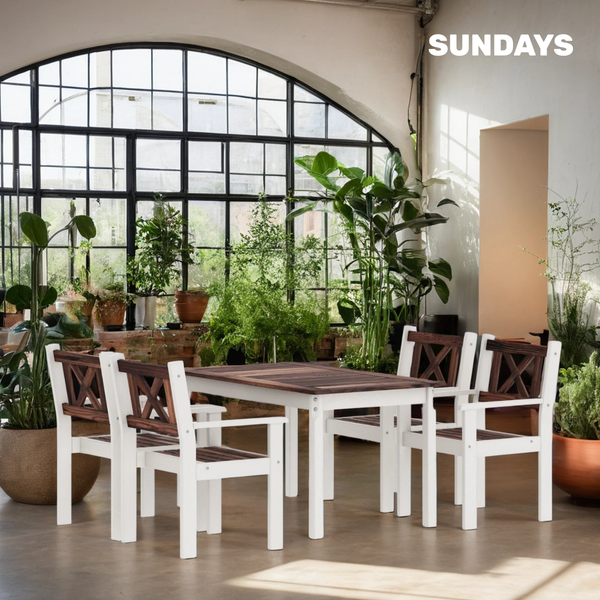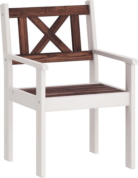 Одним из ключевых элементов дизайна является изящный узор на спинках кресел и скамеек, выполненный из реек. Эти детали придают мебели легкость и элегантность, не утяжеляя ее внешний вид. Подлокотники обеспечивают дополнительный комфорт, создавая удобную поддержку для рук и улучшая эргономику посадки. Стол имеет размеры 133.4×77×75 см и прямоугольную форму, что обеспечивает достаточную площадь для сервировки.