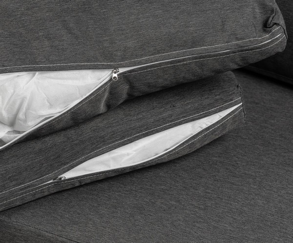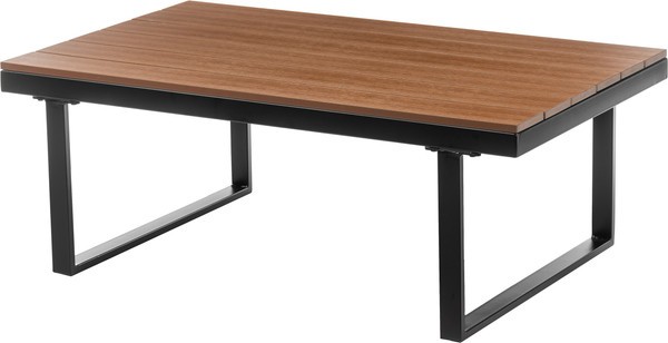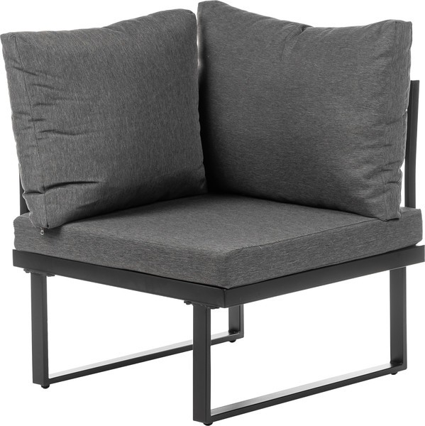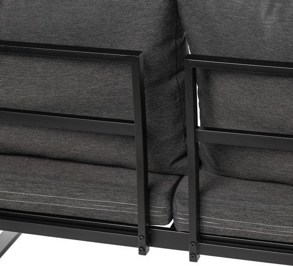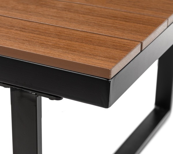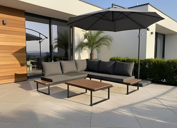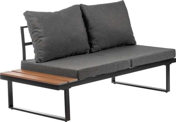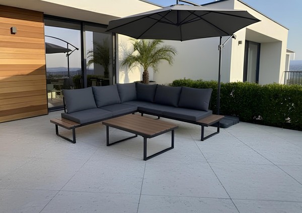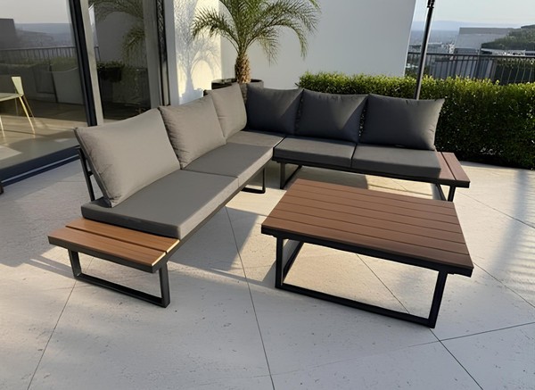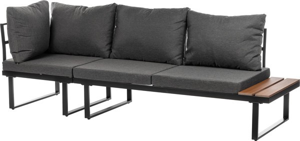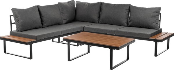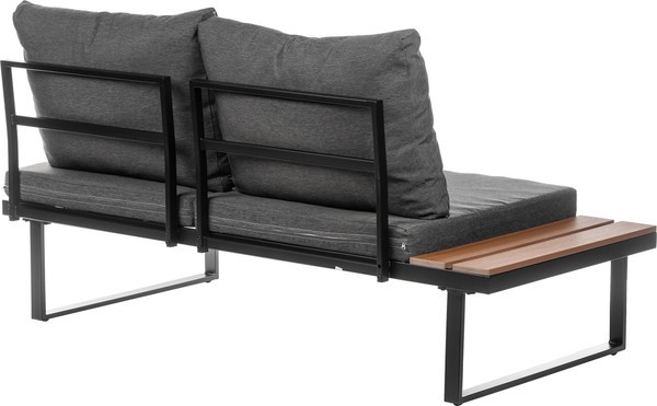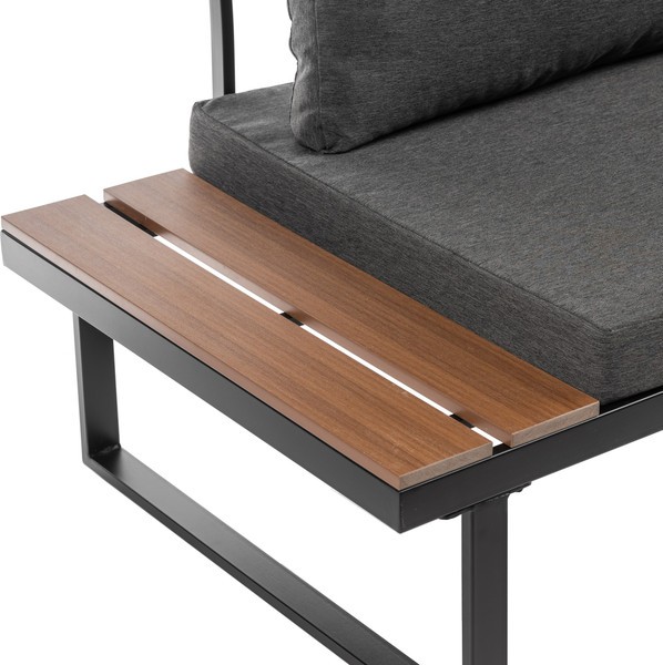 Каркас выполнен из стали черного цвета, что обеспечивает прочность и долговечность. Столешница из дерева средних тонов придает естественный вид и гармонично вписывается в ландшафт. Мягкие сиденья в виде подушек обиты водонепроницаемым полиэстером серого цвета, что добавляет комфорт при использовании.