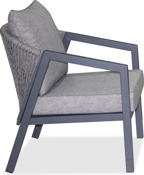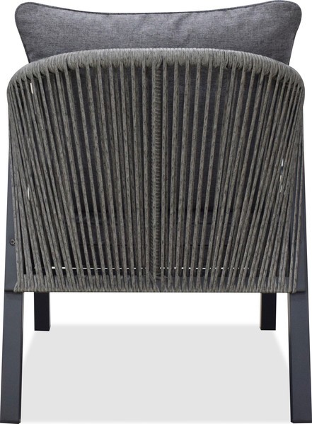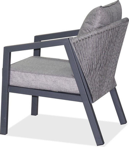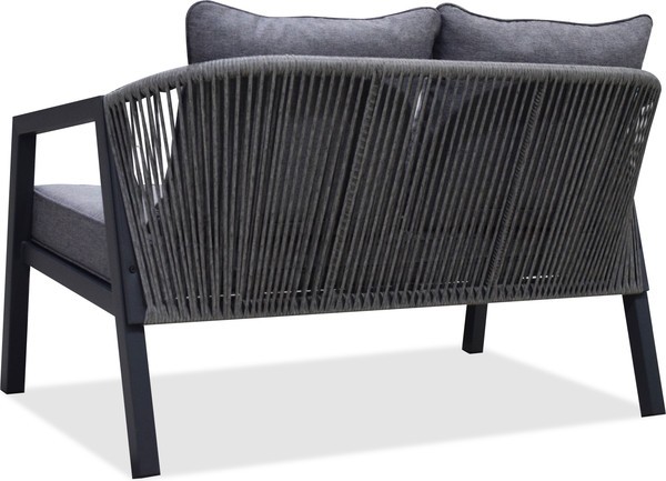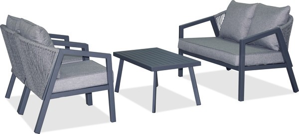 Каркас выполнен из стали серого цвета, что придает прочность и устойчивость к внешним воздействиям. Столешница также изготовлена из стали, что обеспечивает долговечность. Мягкие сиденья в виде подушек выполнены из полиэстера толщиной 10 см и дополнены искусственным ротангом, что создает комфорт и стильный внешний вид. Однотонный дизайн и плетение придают мебели современный дизайн.