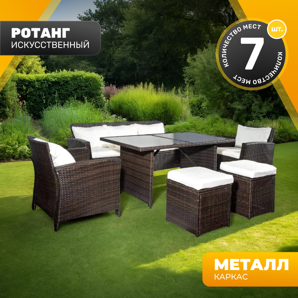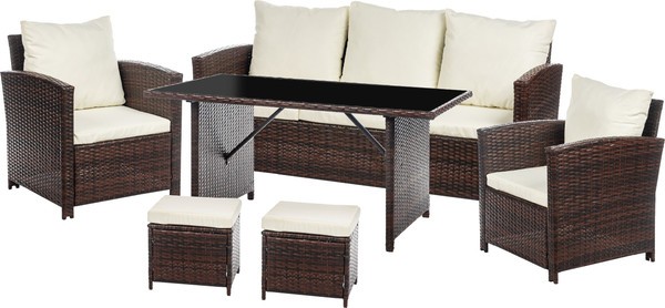 Комплект садовой мебели из шести предметов создает комфортную зону отдыха для загородного дома, веранды, террасы или сада. В набор входят прямоугольный стол, диван, два кресла и два пуфа, что позволяет разместить до семи человек.