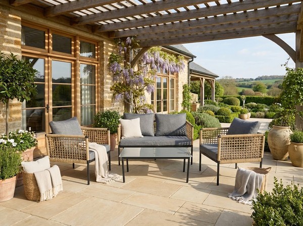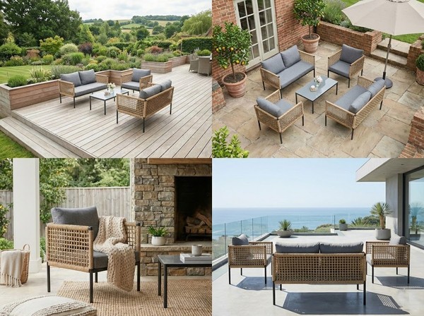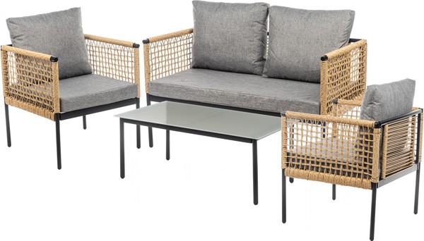 Комплект садовой мебели включает в себя четыре предмета: диван, стол и два кресла, что позволяет комфортно разместить до четырех человек и делает набор подходящим выбором для веранды загородного дома или дачи.