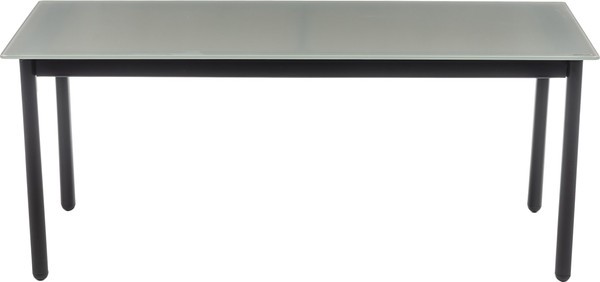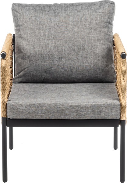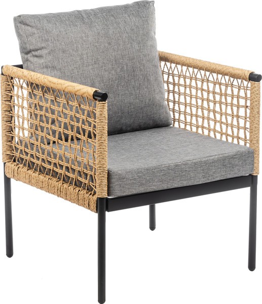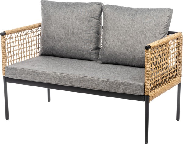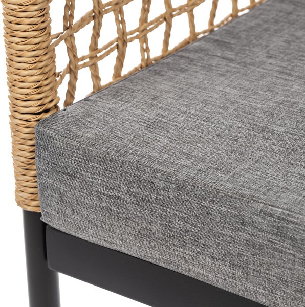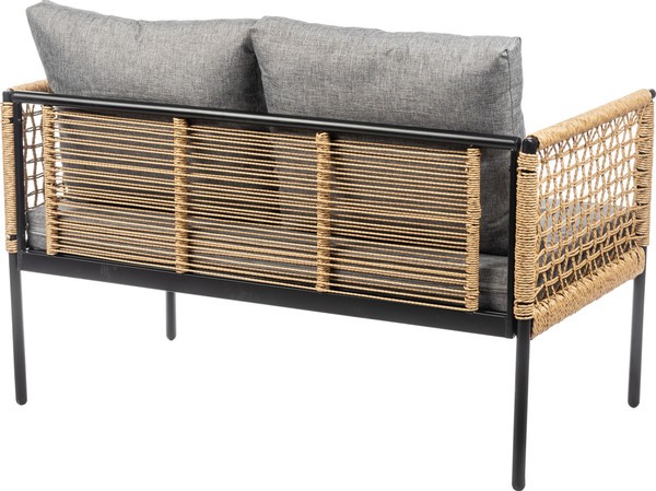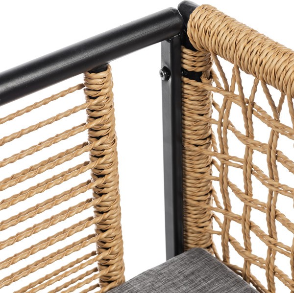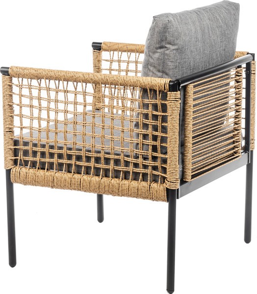 Каркас выполнен из стали черного цвета, что придает прочность и устойчивость. Столешница из стекла обеспечивает легкость в уходе и стильный внешний вид, а обивка из текстиля серого цвета и натурального ротанга добавляет комфорта. Однотонный дизайн и прямоугольная форма столешницы создают современный и лаконичный стиль.