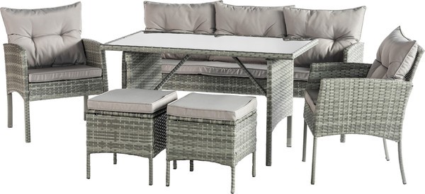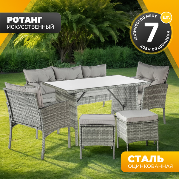Комплект садовой мебели из шести предметов включает диван, два кресла, стол и два табурета. Подходит для обустройства террасы, веранды загородного дома или дачи, рассчитан на 7 мест.