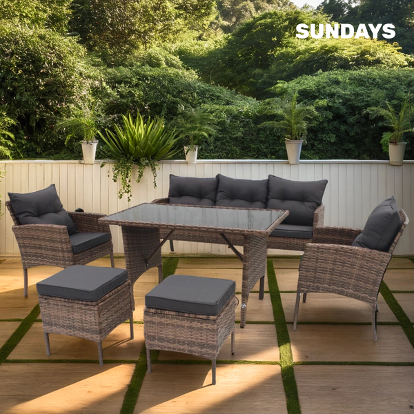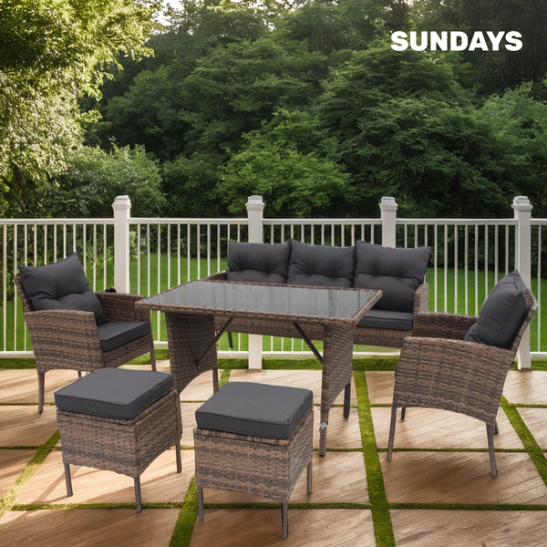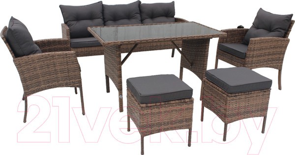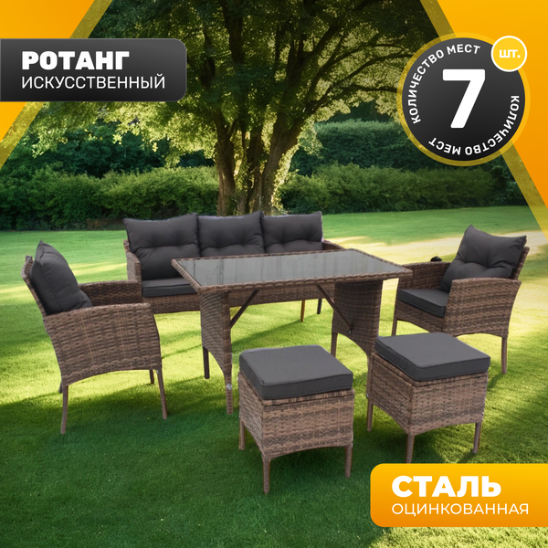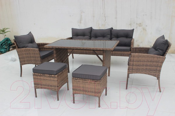 Комплект садовой мебели из шести предметов включает диван, два кресла, стол и два табурета. Подходит для обустройства террасы, веранды загородного дома или дачи, рассчитан на 7 мест.