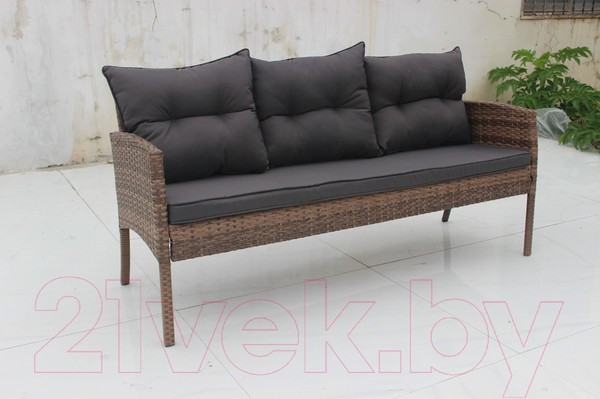 Столешница из закаленного стекла устойчива к нагрузкам и погодным условиям. Мягкие сиденья с текстильной обивкой представлены подушками из водонепроницаемой ткани. Толщина матраса — 6 см, что повышает комфорт. Подлокотники у дивана и кресел добавляют удобства.