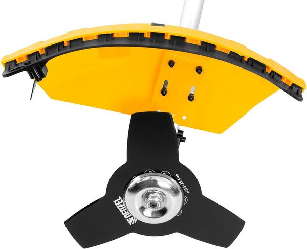 Две режущие насадки - трехлопастной нож и катушка с леской вращаются со скоростью 9500 об/мин, обеспечивая ширину скашивания 25.5 и 42 см.