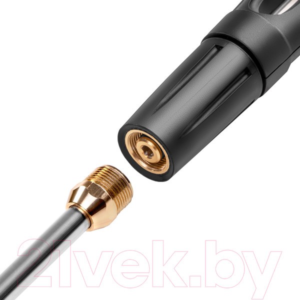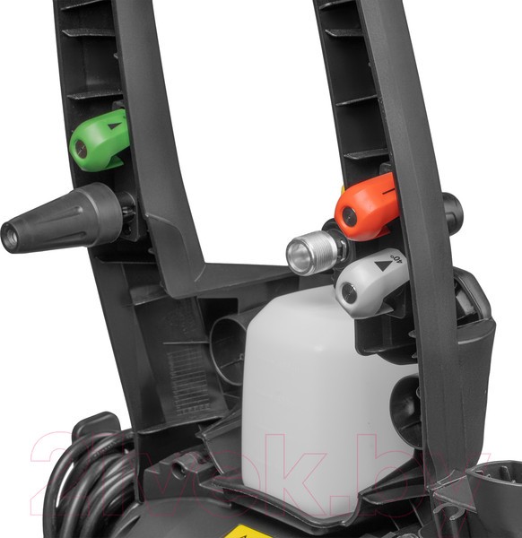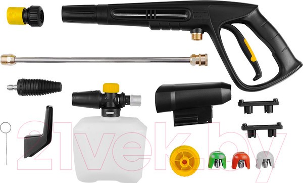 В комплекте: пистолет высокого давления, распылитель, пеногенератор, форсунки 3 шт., насадка распылитель Turbo, переходник, быстросъем для шланга 3/4, гибкий шланг высокого давления, колеса, игла для очистки сопла.