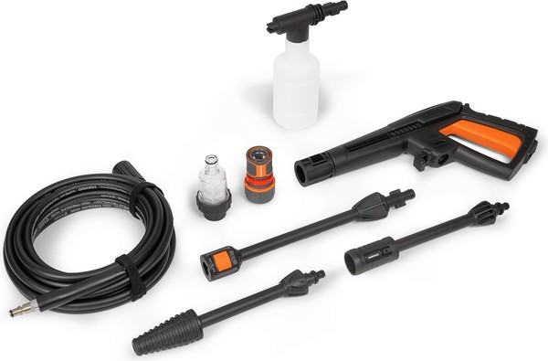 - Полный комплект для работы из коробки. Помимо моющей насадки Home&Car Jet, в комплект поставки входит все необходимое: мягкий шланг высокого давления длиной 6м, грязевая фреза, пеногенератор, фильтр тонкой очистки, коннектор для садового шланга DWC 2500 с функцией аквастоп.