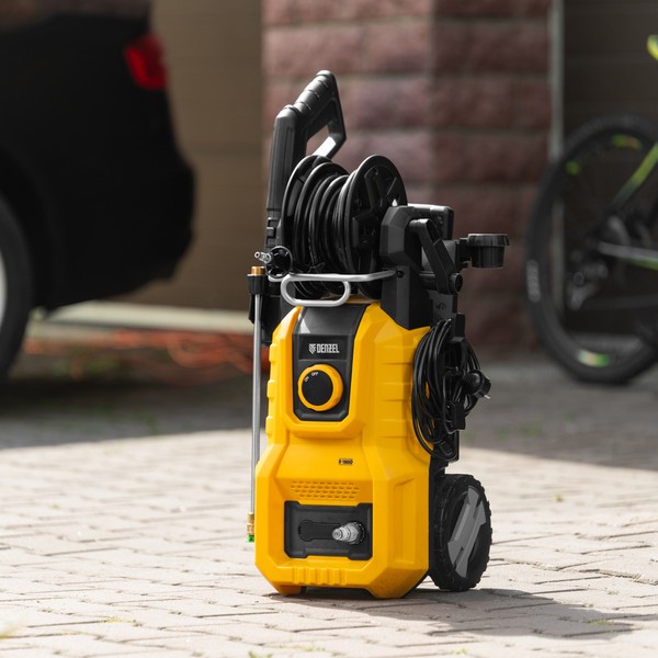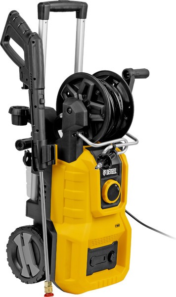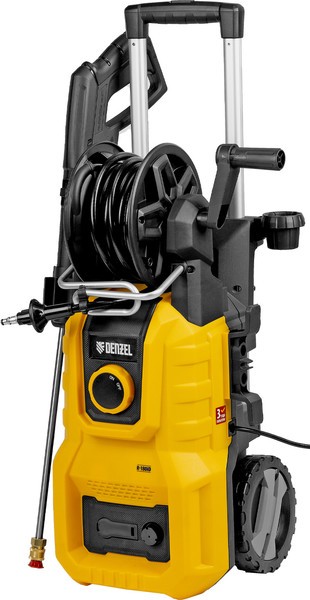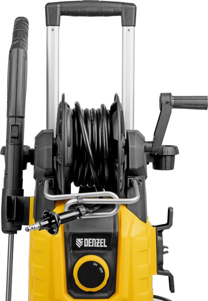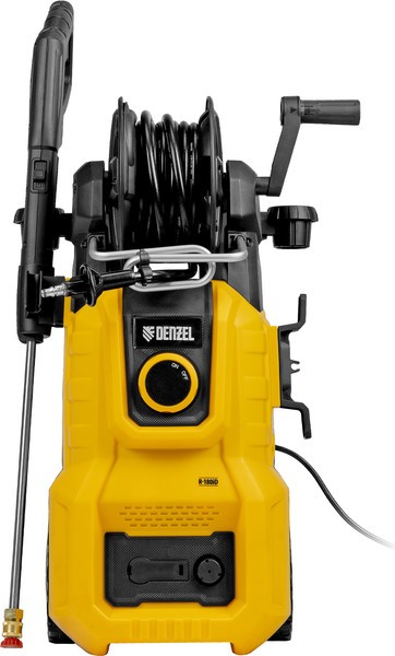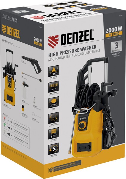 Очиститель высокого давления Denzel R-180iD. Конструктивные особенности: бак для моющего средства, катушка для шланга, колеса, фильтр, ручка для перемещения.Функции: блокировка от случайного нажатия, защита двигателя от перегрева, предохранительный клапан, функция всасывания