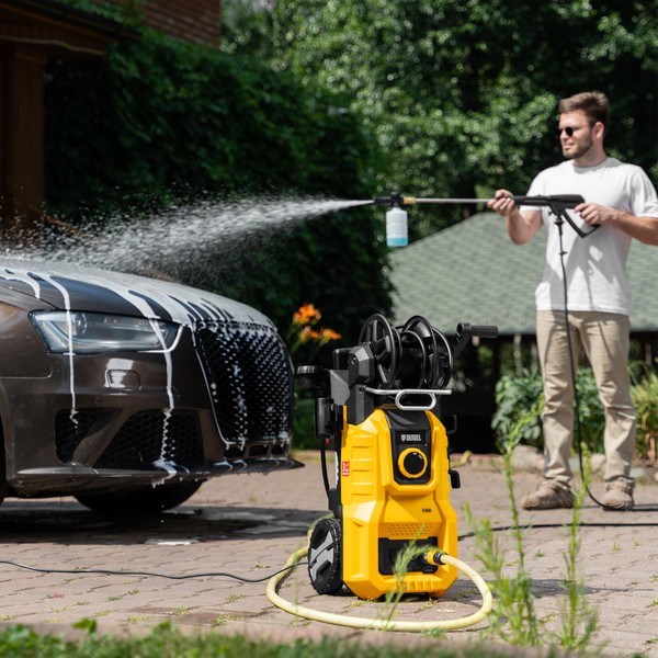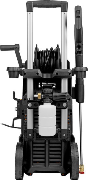 - Удобное использование — функциональный барабан подключен к магистрали высокого давления, поэтому вы можете разматывать и убирать шланг на барабан, не отсоединяя его от мойки.