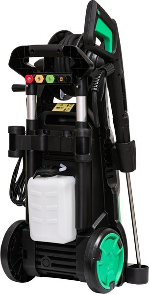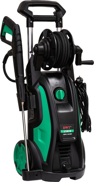 Очиститель высокого давления DWT HDP21-165 DRW. Конструктивные особенности: бак для моющего средства, фильтр, катушка для шланга, колеса, ручка для перемещения (телескопическая). Расположение бака для моющего средства в корпусе. Функции: предохранительный клапан (защита от превышения давления), защита двигателя от перегрева