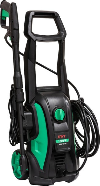 Очиститель высокого давления DWT HDRP16-135. Конструктивные особенности: бак для моющего средства, фильтр, колеса, ручка для перемещения. Расположение бака для моющего средства на пистолете. Функции: защита двигателя от перегрева, предохранительный клапан (защита от превышения давления)