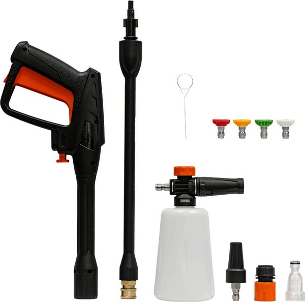 Богатая комплектация включает фильтр для воды, комплект насадок, пеногенератор и переходники, что позволяет приступить к работе сразу после покупки.