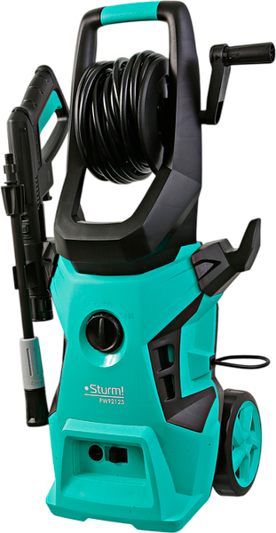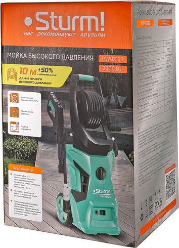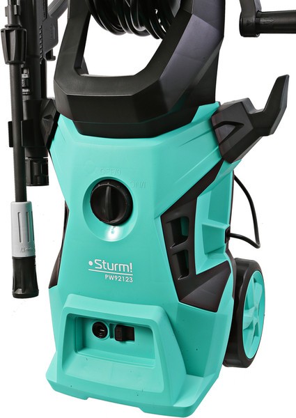 Очиститель высокого давления Sturm PW92123. Конструктивные особенности: бак для моющего средства, фильтр, отсек для принадлежностей, колеса, катушка для шланга. Расположение бака для моющего средства в корпусе. Функции: автоматическое отключение, защита двигателя от перегрева
