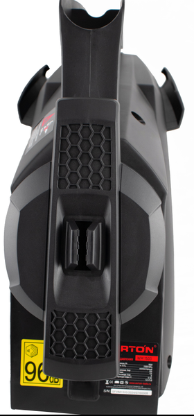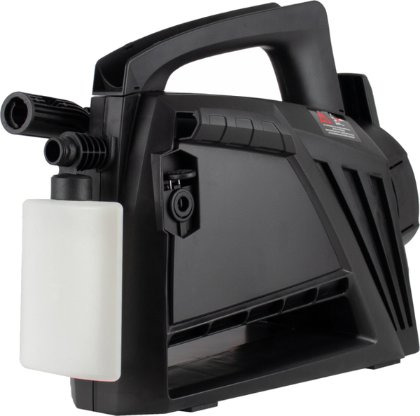 Очиститель высокого давления Verton WM-1500. Конструктивные особенности: бак для моющего средства, ручка для перемещения, фильтр. Расположение бака для моющего средства отдельно.