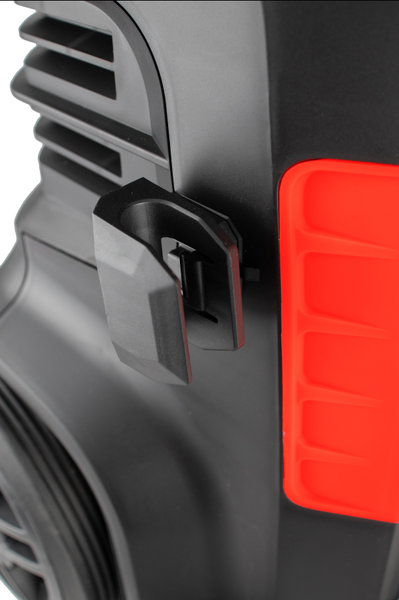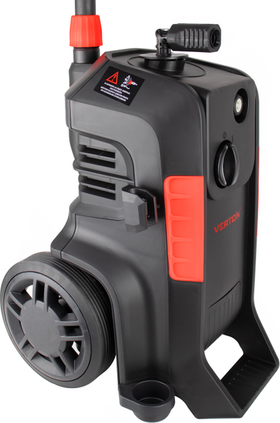 Очиститель высокого давления Verton WM-1700. Конструктивные особенности: колеса, фильтр, ручка для перемещения, бак для моющего средства. Расположение бака для моющего средства отдельно.