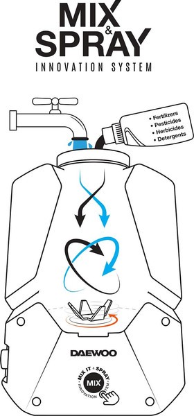 Функция смешивания «MIX&SPRAY». Раствор для распыления легко приготовить в самом баке опрыскивателя благодаря работе дополнительной помпы, которая создает водяной поток внутри бака и способствует эффективному растворению в воде пестицидов, гербицидов, удобрений или моющих средств.