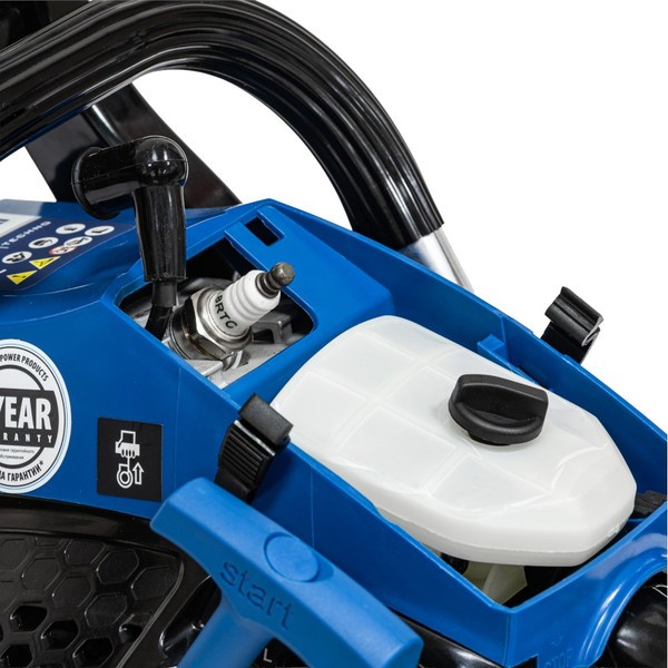 - Низкопрофильная цепь 3/8LP на 52 звена с заточкой full chisel обеспечивает мягкое пиление без вибраций и снижает риск обратного удара.