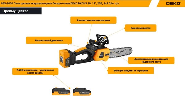 Пила цепная аккумуляторная Deko DKCHS 20 / 085-2000