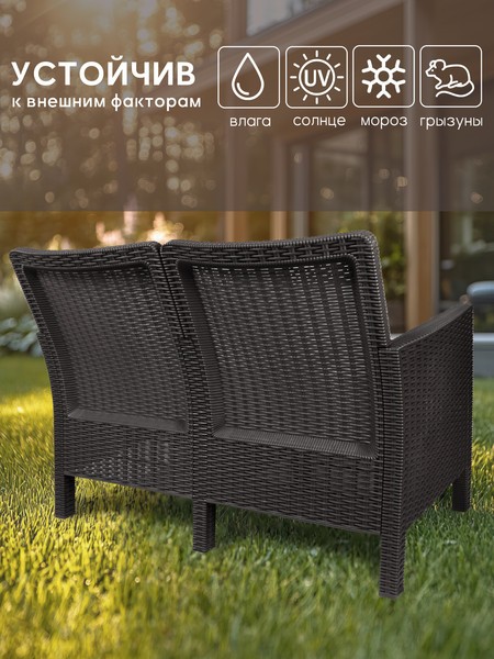 Диван выполнен из высококачественного пластика, устойчивого к ультрафиолету и перепадам температур, что гарантирует долговечность даже в суровых погодных условиях.